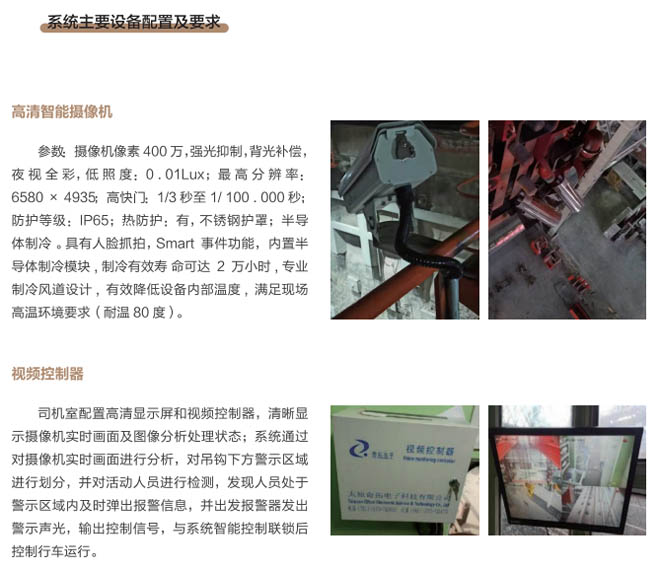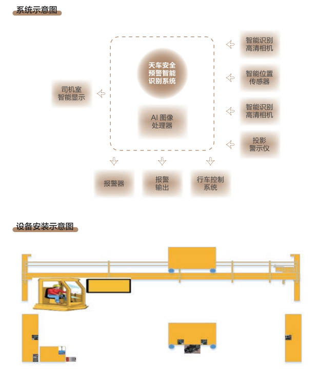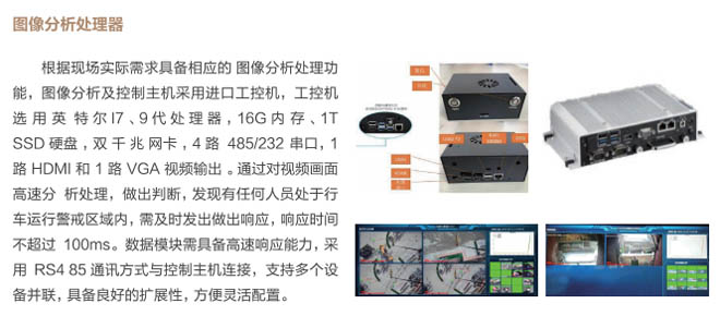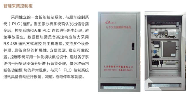 6、行車智控系統:控制系統采用一體化模塊集成設計, 通過各子系統信號采集及圖像分析進 行智能處理,快速準確判斷各功能模 塊的異常現象,與主機PLC控制系統 通訊連接具備自動進行報警、減速、斷電停車等功能,當系統確認發出信號指令后,控制系統和行車PLC連鎖進行斷電處理,避免事故發生。